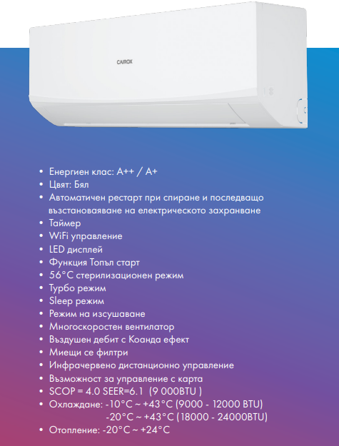 Благодарение на инверторното управление на компресора климатиците Cairox от серията R4L-R+ имат висок клас на енергийна ефективност в режим охлаждане SEER: 6.10 (А++) и режим отопление SCOP: 4.00 (А+). Наслаждавайте се на комфортна среда, без да правите компромис с енергийната ефективност.